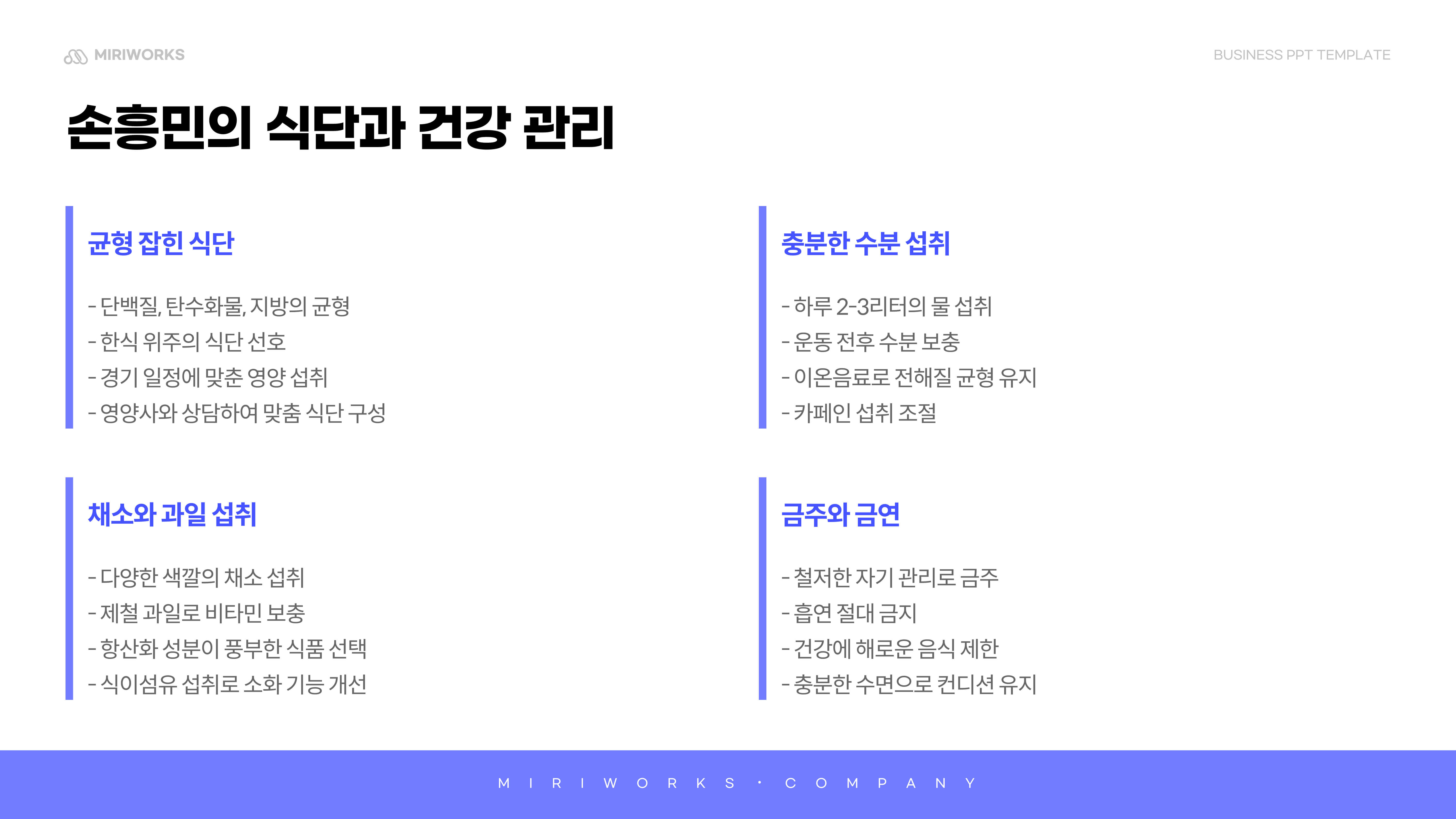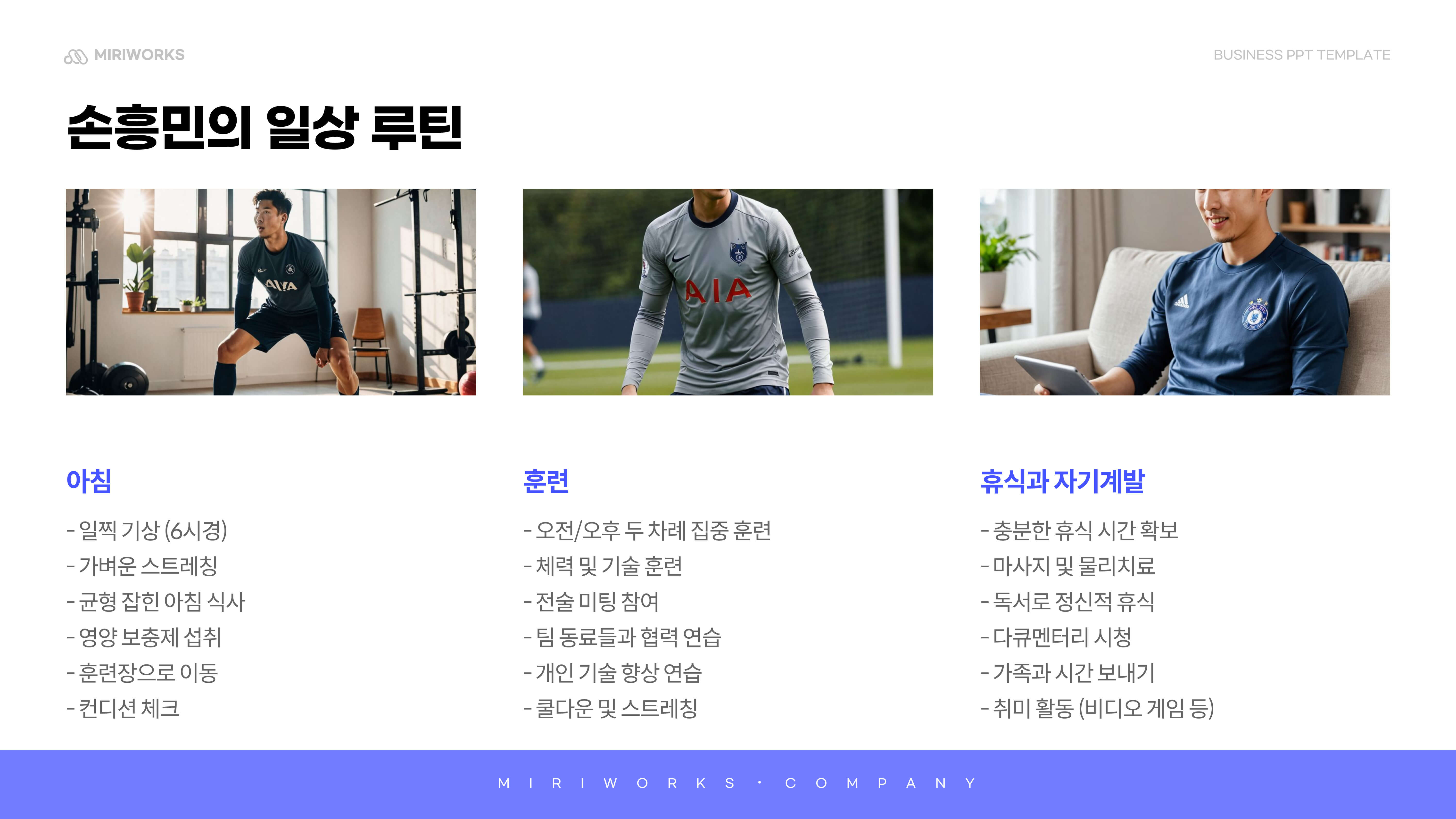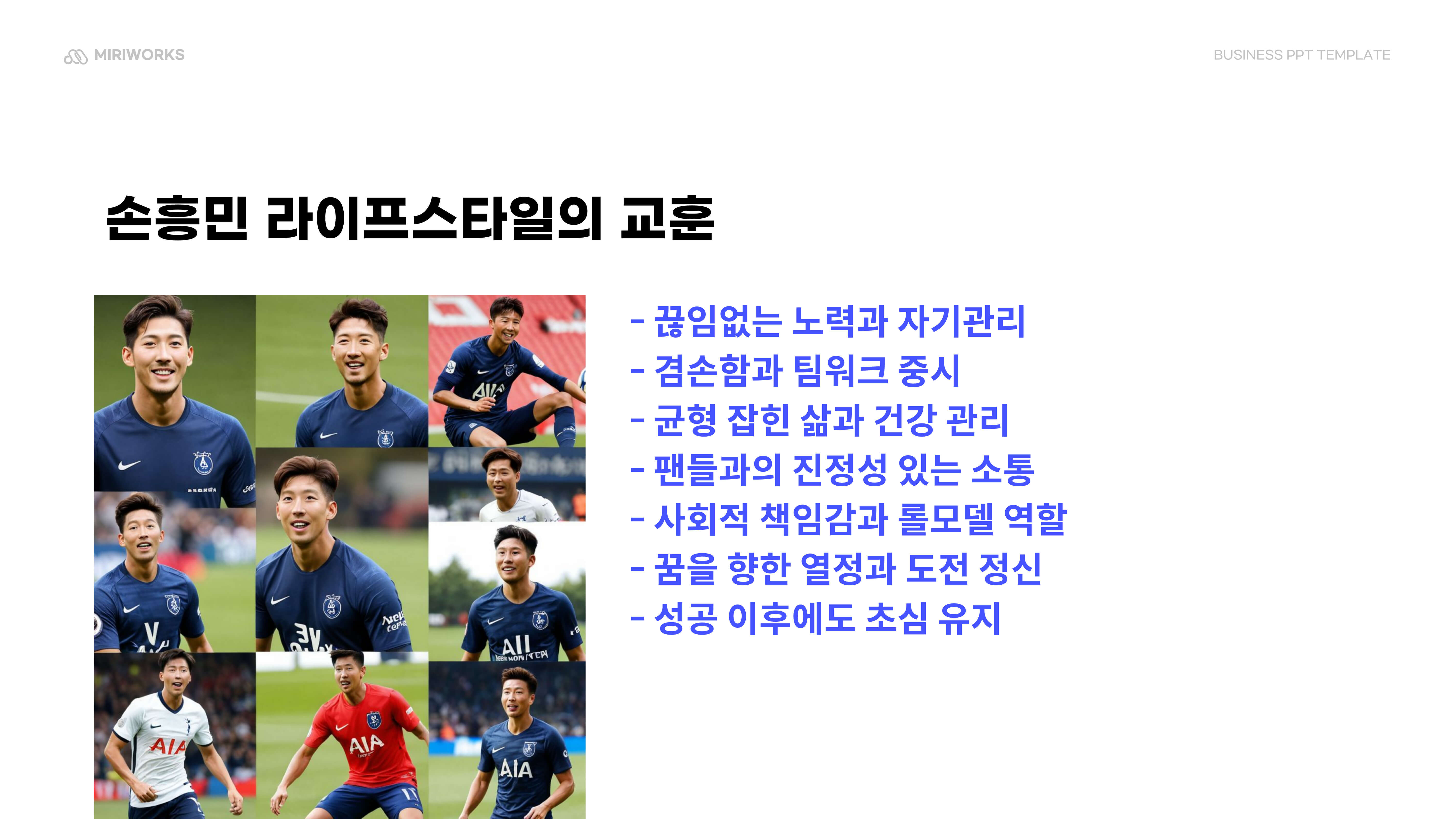 ✔ 꾸준한 자기관리: 손흥민은 항상 최고를 목표로 하며, 자기관리에 철저합니다.