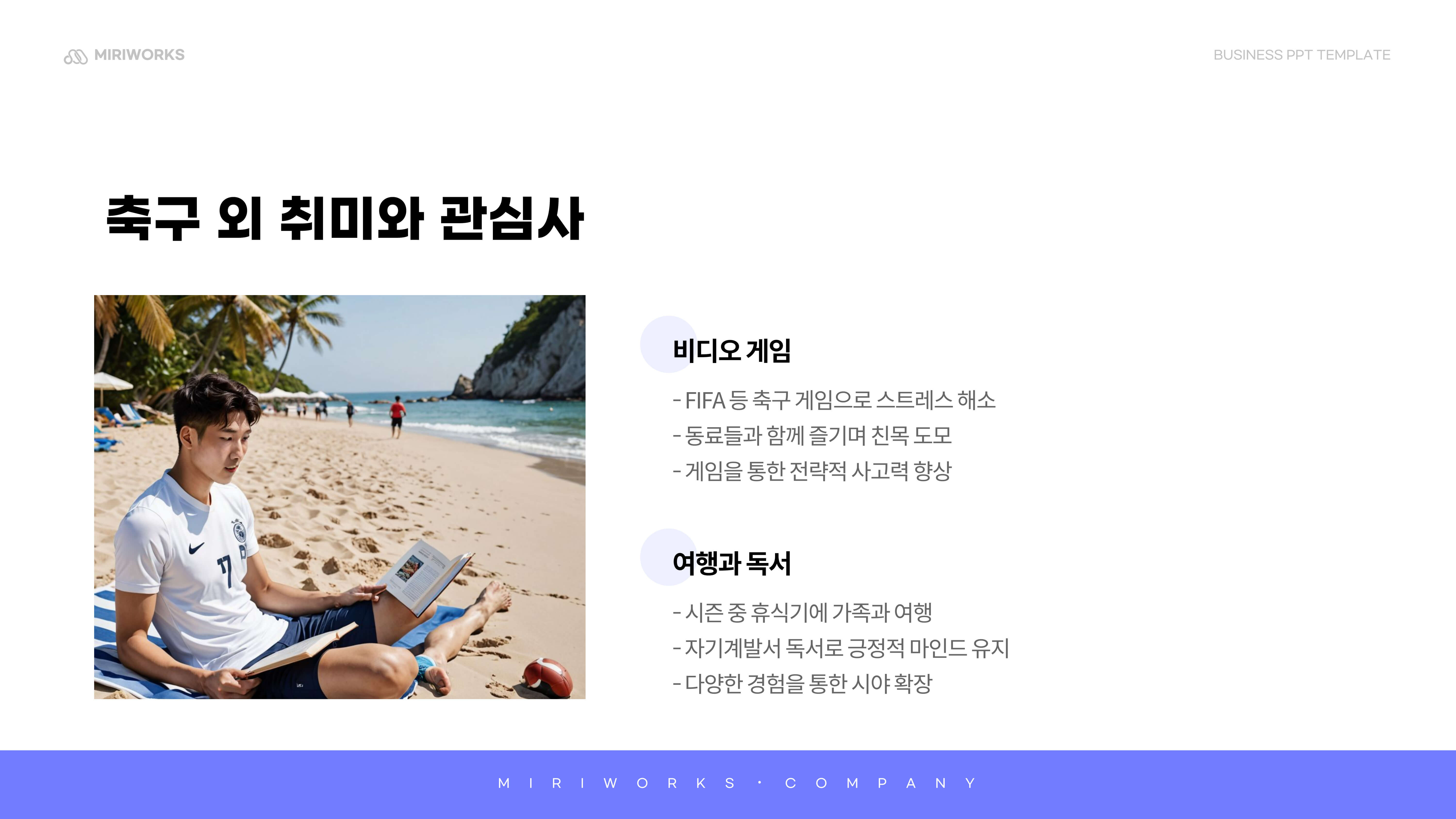 ✅ 자기계발: 독서를 하거나 다큐멘터리를 보며 축구 외적인 지식도 쌓습니다.