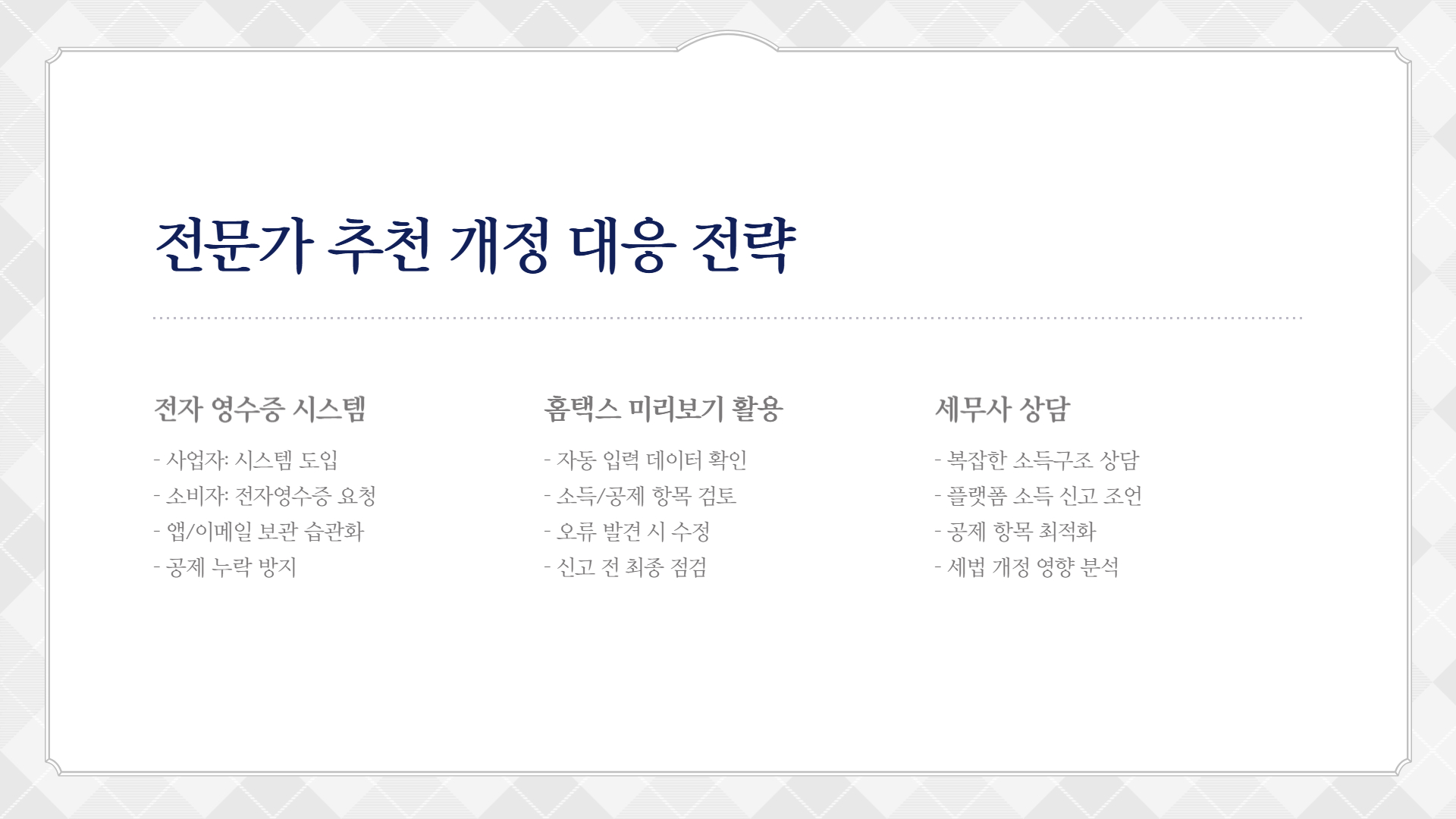 특히 플랫폼 소득 신고 자동화와 전자 영수증 의무화는 신고 과정을 간소화하지만, 사전 준비가 더욱 중요해졌습니다.