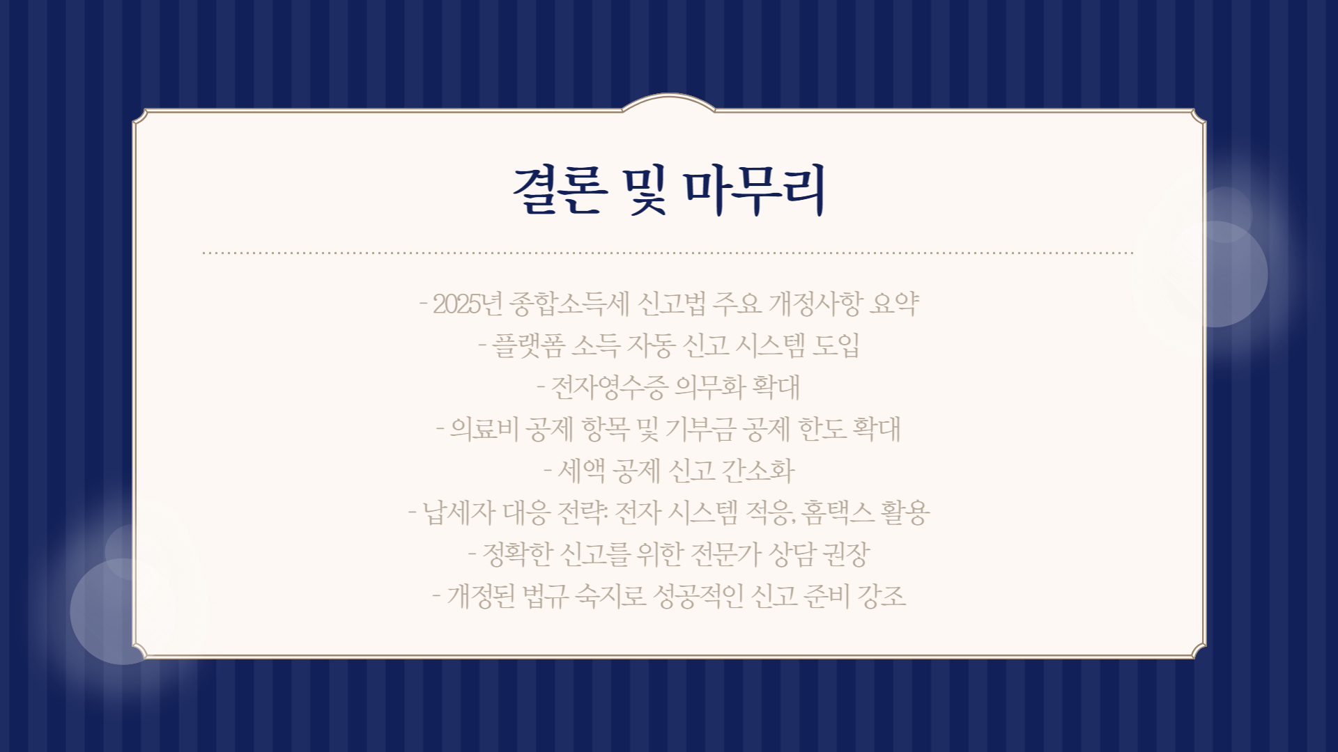 여러분도 이번 개정사항을 잘 숙지하고, 홈택스와 전문가의 도움을 활용해 성공적인 신고를 준비해 보세요!
