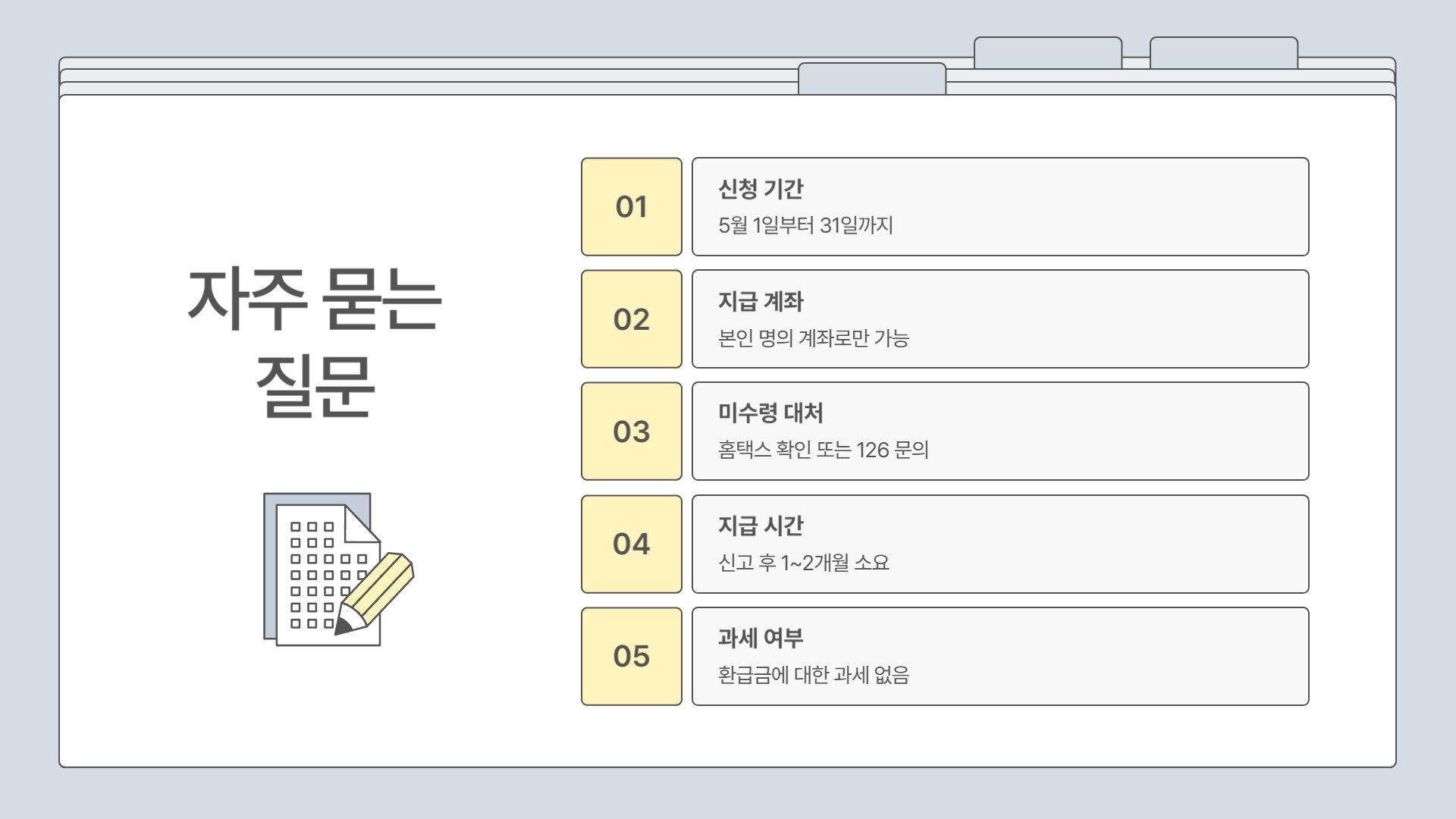 - 신고 마감일 준수: 신고 마감일 이후에는 환급 신청이 어려울 수 있습니다.