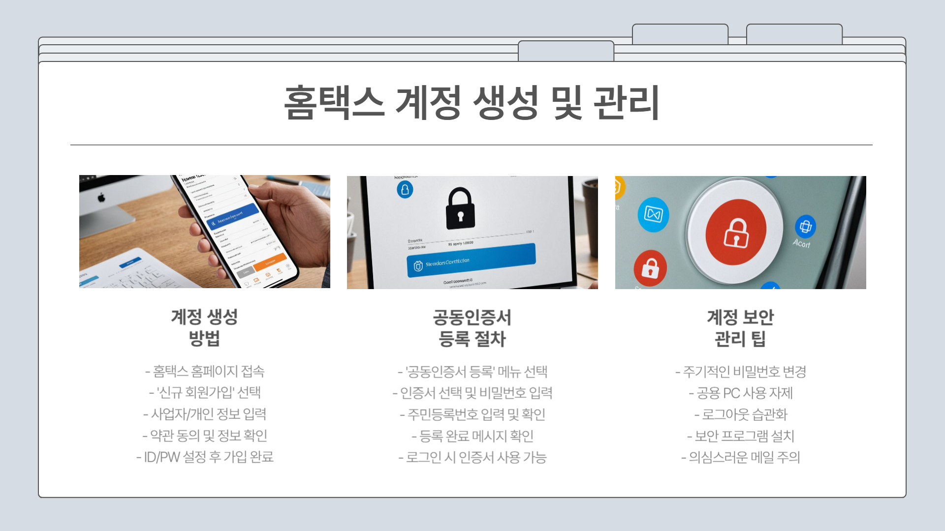 - 홈택스 계정 정보 (공동인증서 또는 간편 인증)