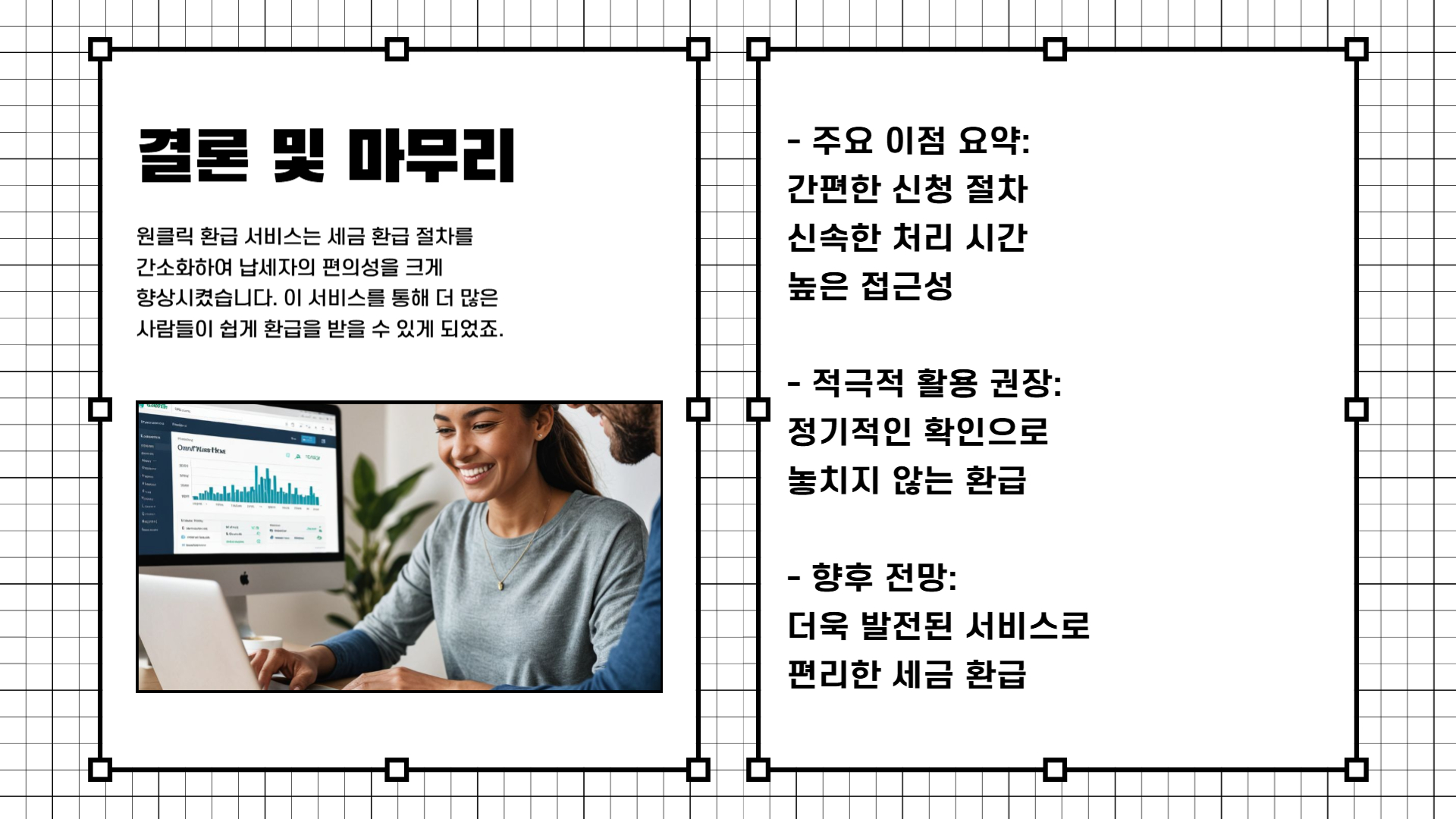 홈택스 원클릭 환급 서비스는 세금 환급 절차를 크게 간소화하여, 많은 사람들이 보다 쉽게 환급을 받을 수 있게 돕습니다. 필요한 조건과 절차를 잘 숙지하고, 적절히 활용하여 세금 환급을 빠르게 받아보세요.