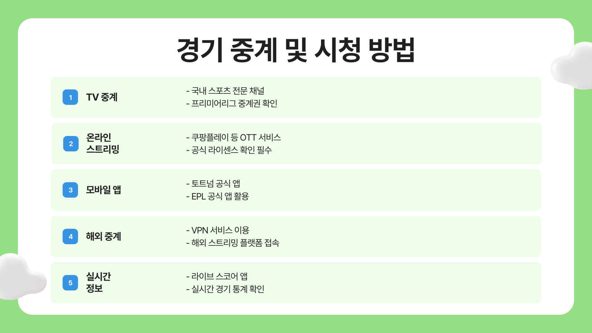 1️⃣ 일정을 미리 체크: 해외 경기는 시차를 감안해 일정을 확인하세요.